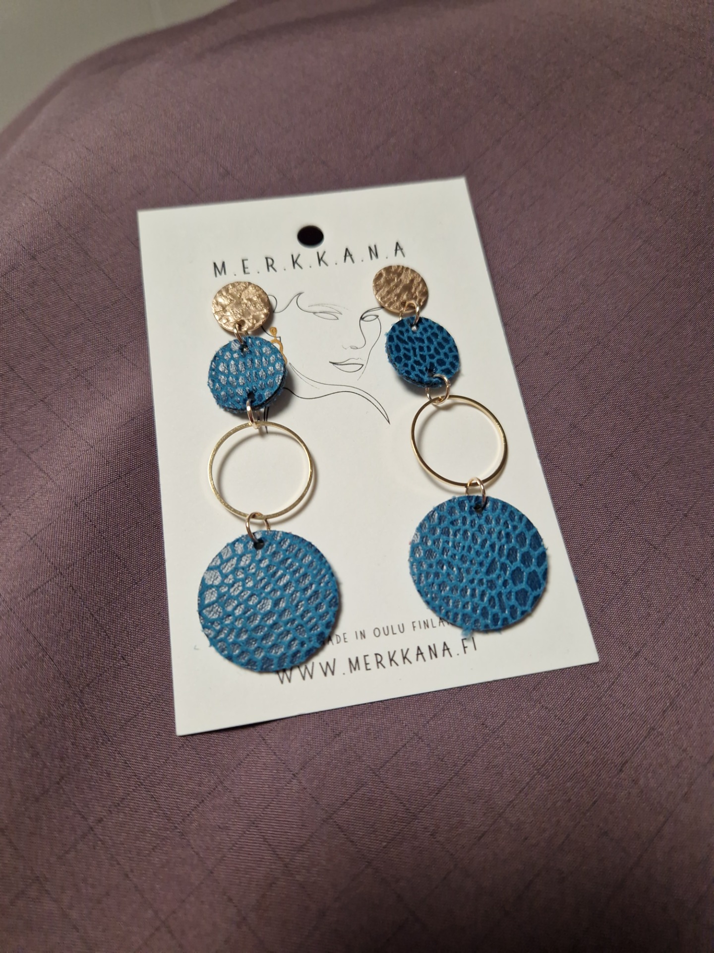 Kevyet ja uniikit Merkkana-korvakorut valmistetaan käsityönä Oulunsalossa. Korvakorut tehdään vanhasta ja uudesta nahasta sekä tekstiileistä ja viimeistellään ripauksilla helmiä ja ketjuja.