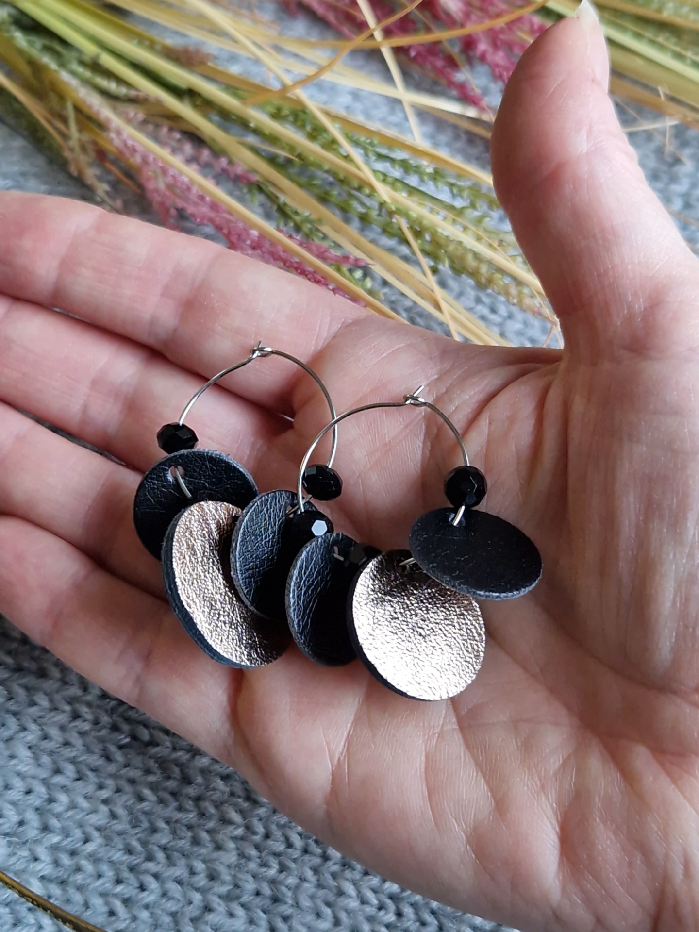 Rengaskorvakorut lasihelmillä ja mustilla ja ruusukultaisilla paloilla.