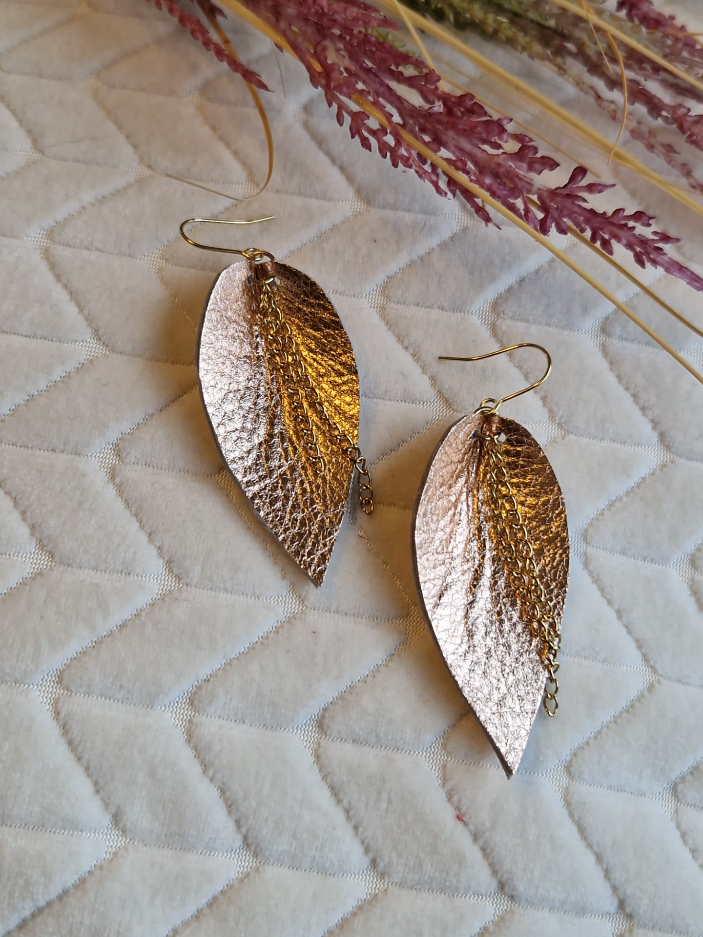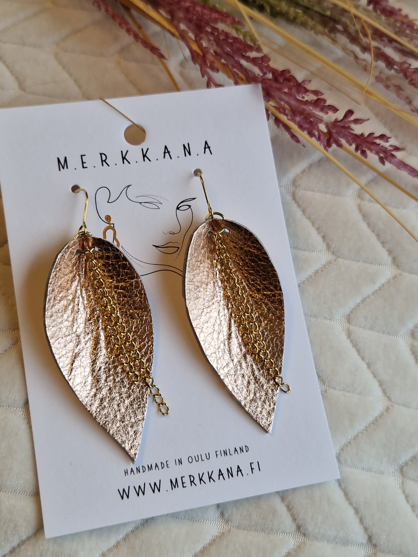 Lehtikorvakorut on leikattu ruusukultaisesta nahasta. Nahka on liimattu kaksinkertaiseksi. Koska lehdet leikataan käsin, jokainen on oma uniikki kappaleensa. Keskellä on ruusukultainen ketju.