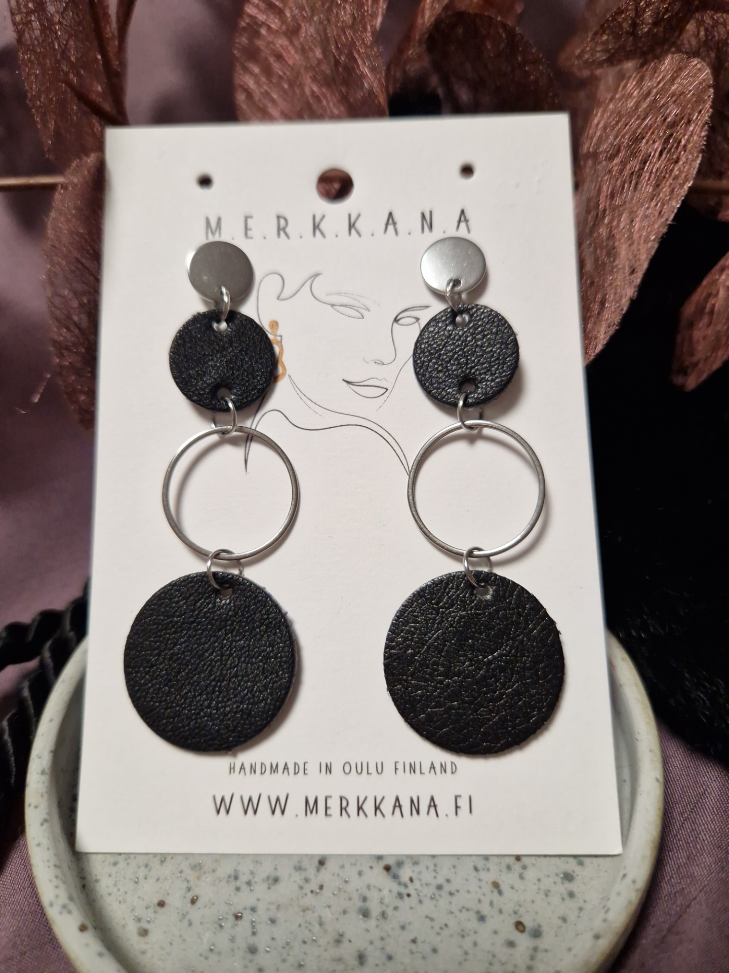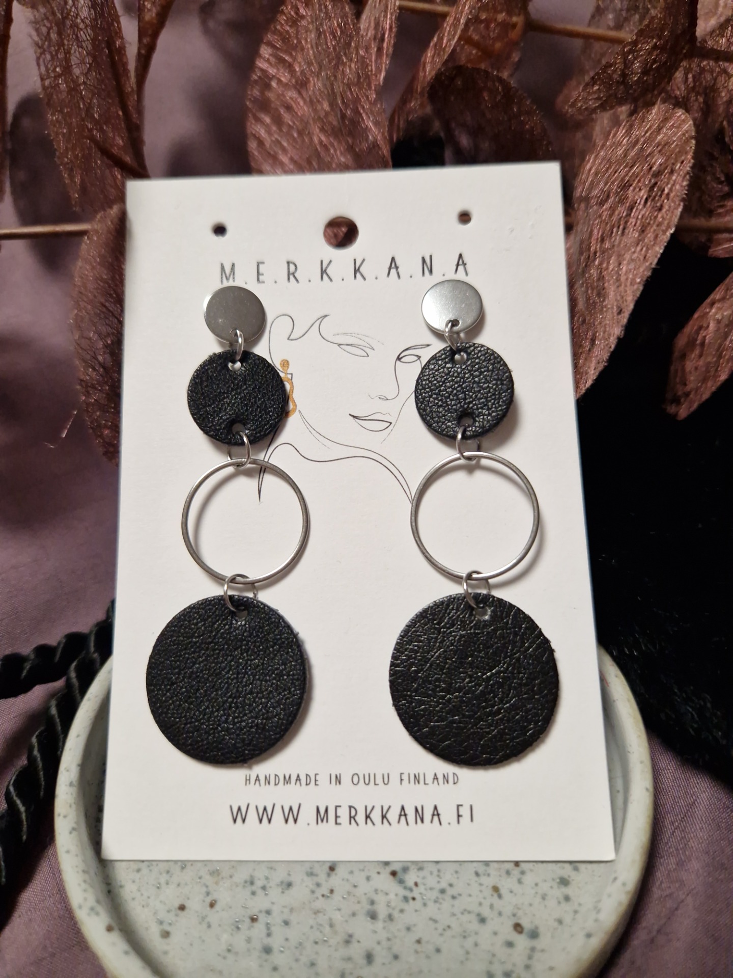 Mustaa jäljitelmänahkaa, teräksen värisellä renkaalla.
