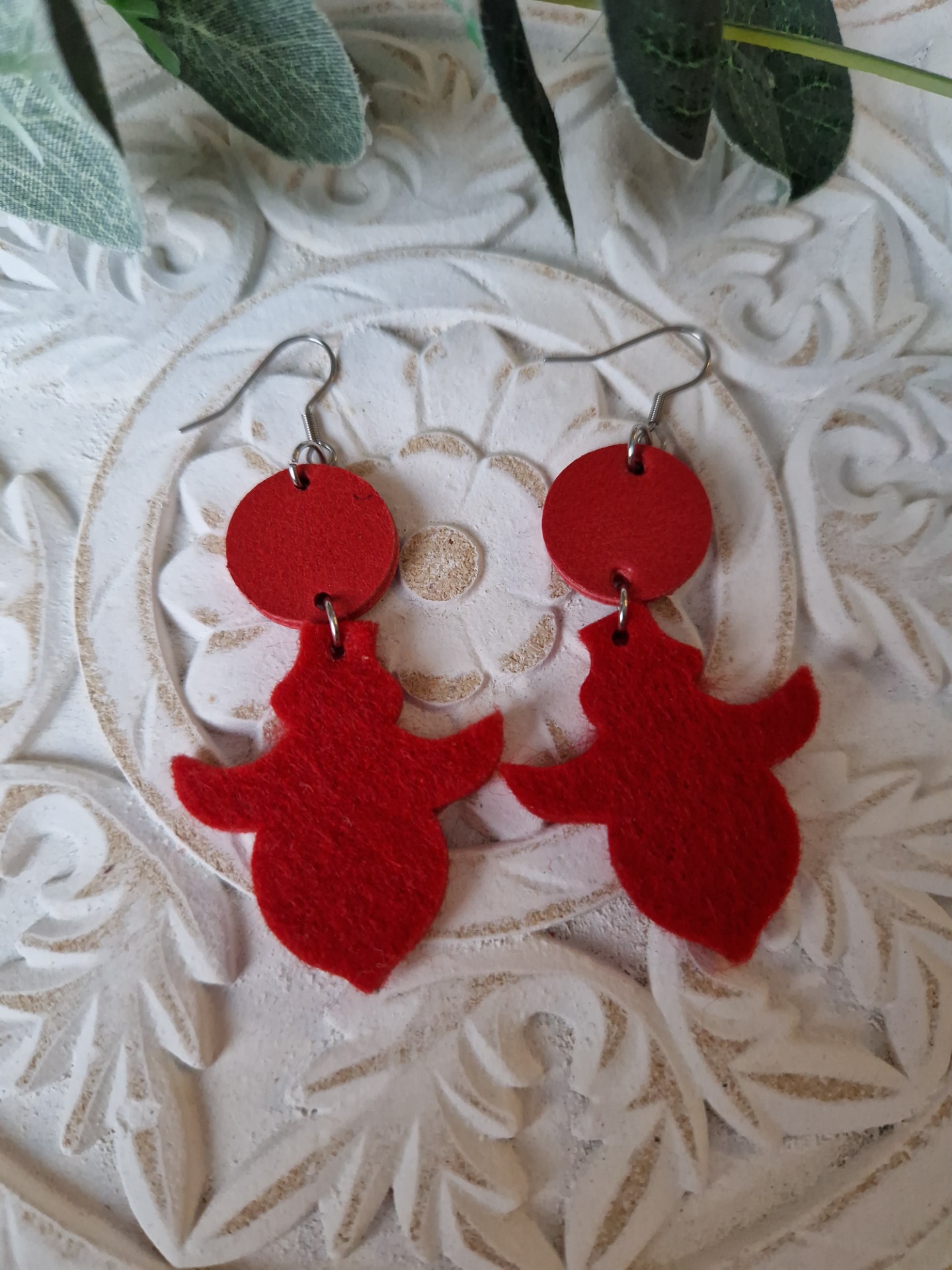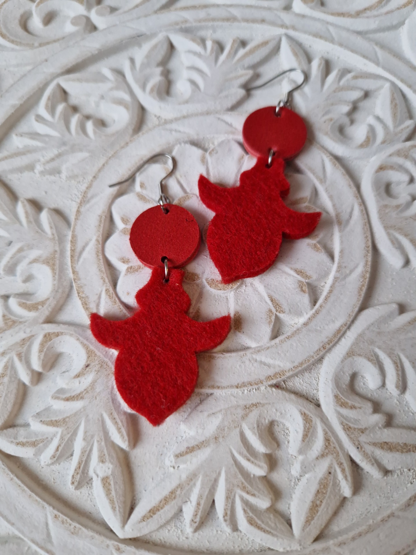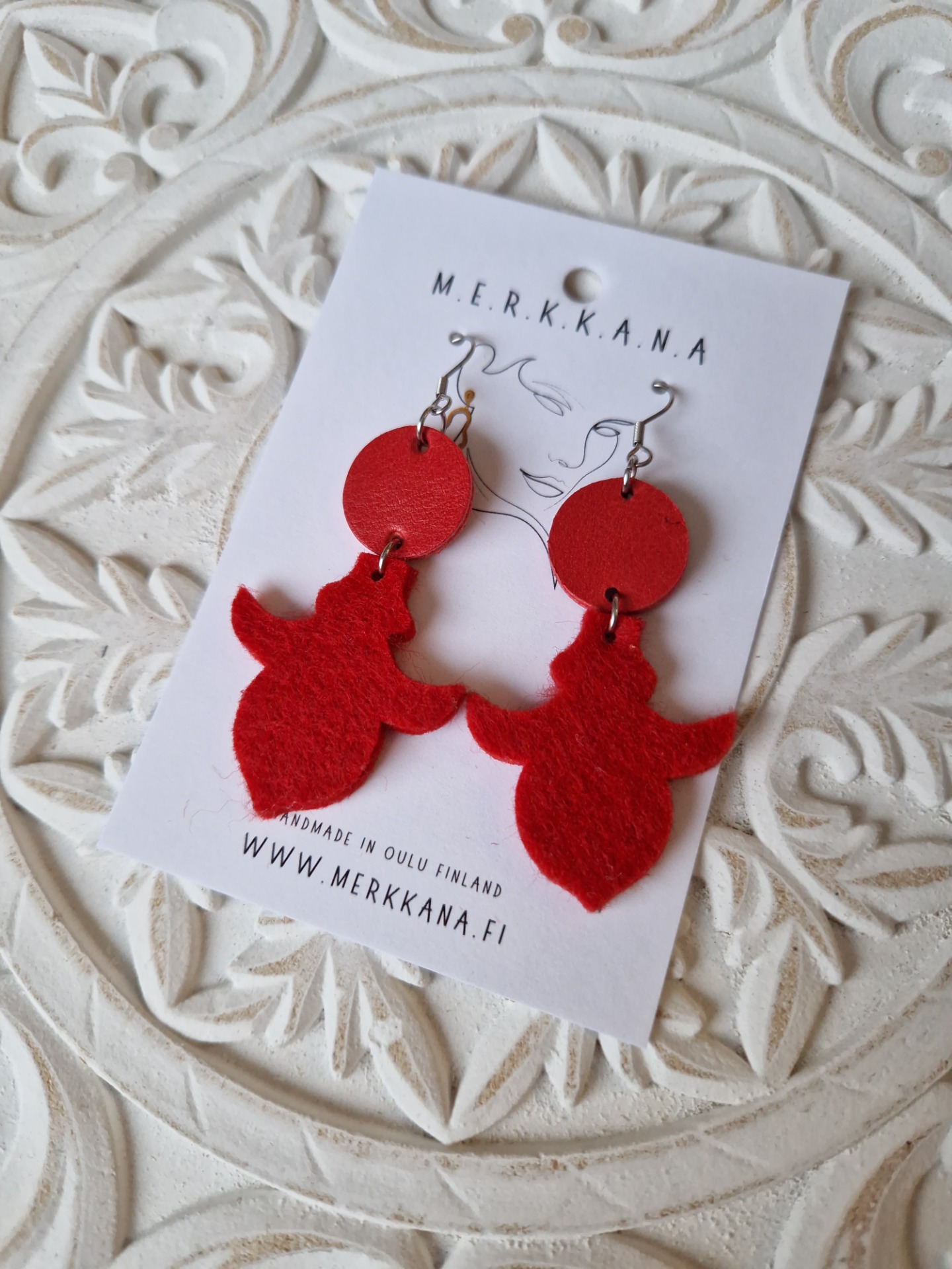 Punaiset nahasta ja huovasta valmistetut korvakorut.