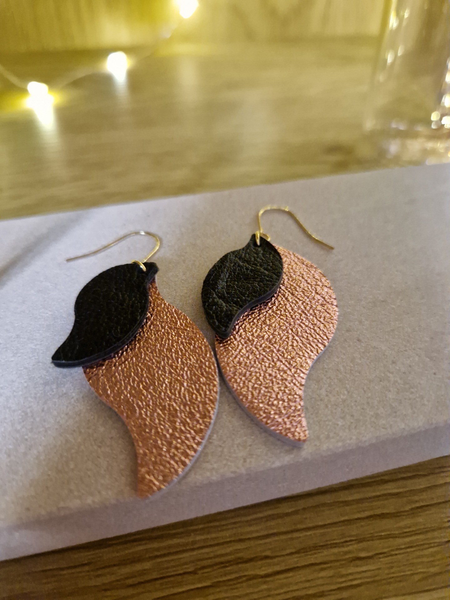 Musta jäljitelmänahka on peräisin askartelujämistä ja se on liimattu kaksinkertaiseksi. Ruusukultainen nahka on uutta materiaalia ja on oikeaa nahkaa