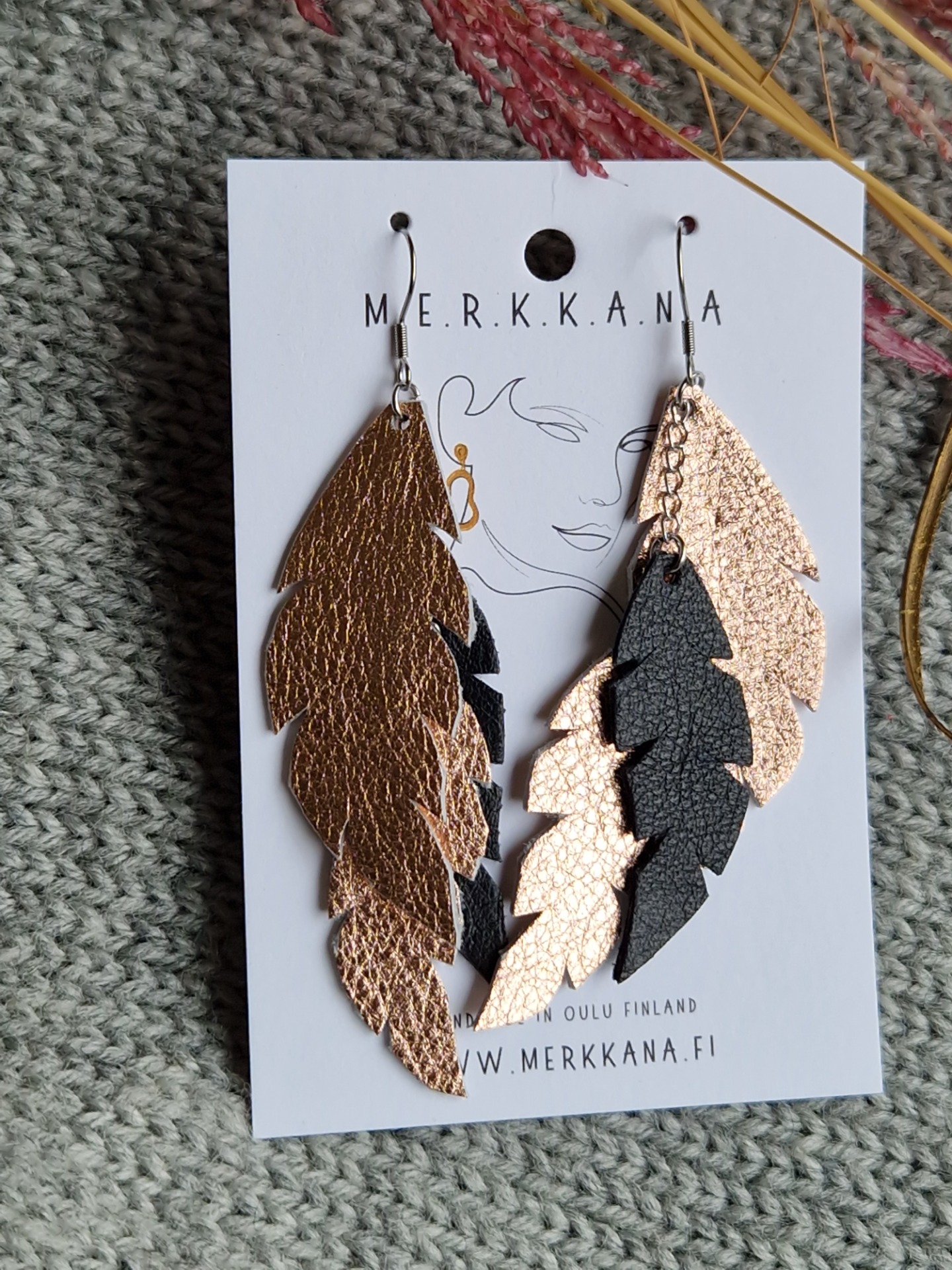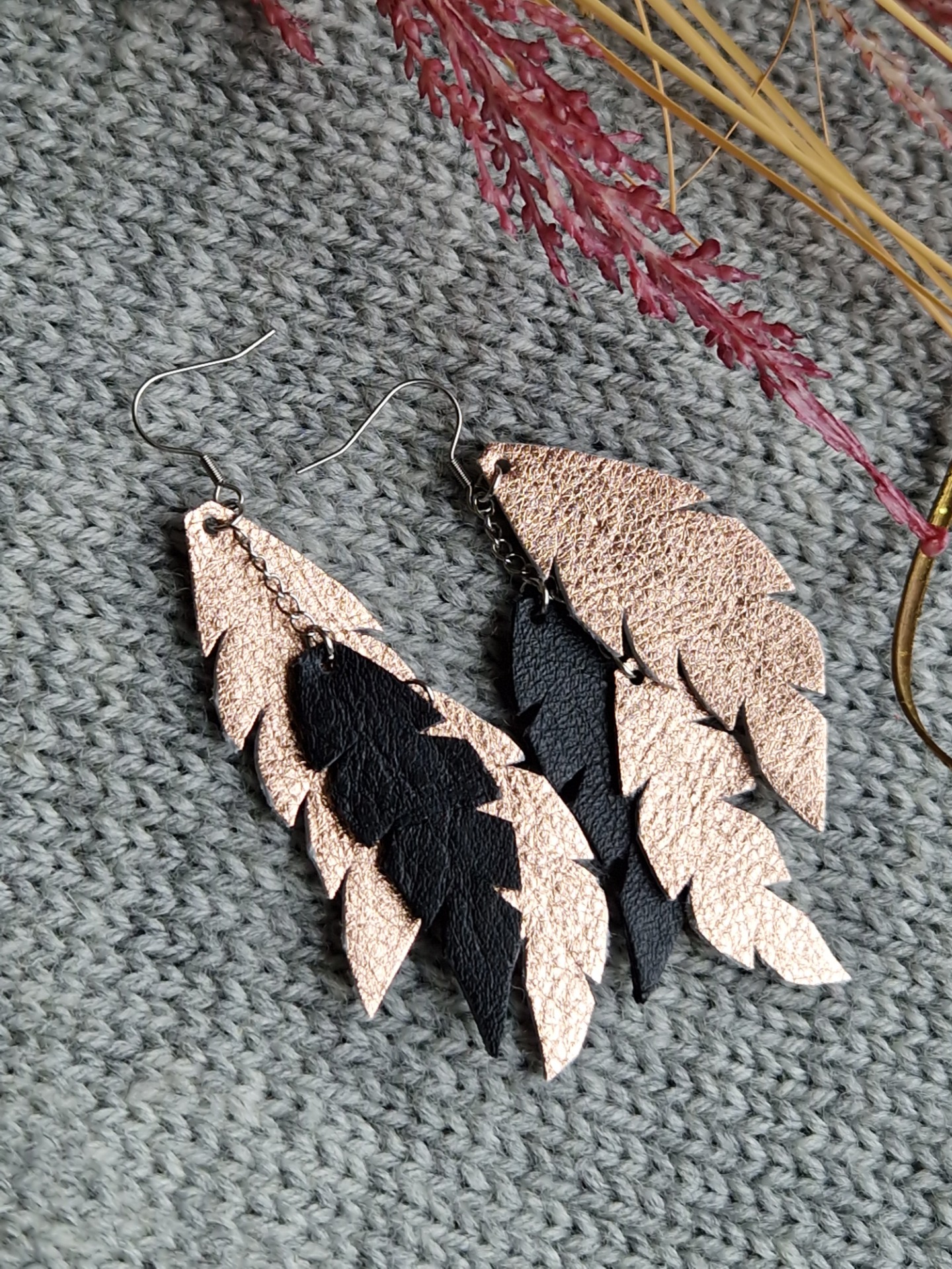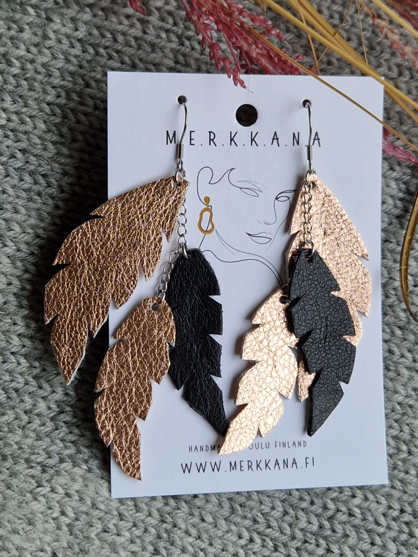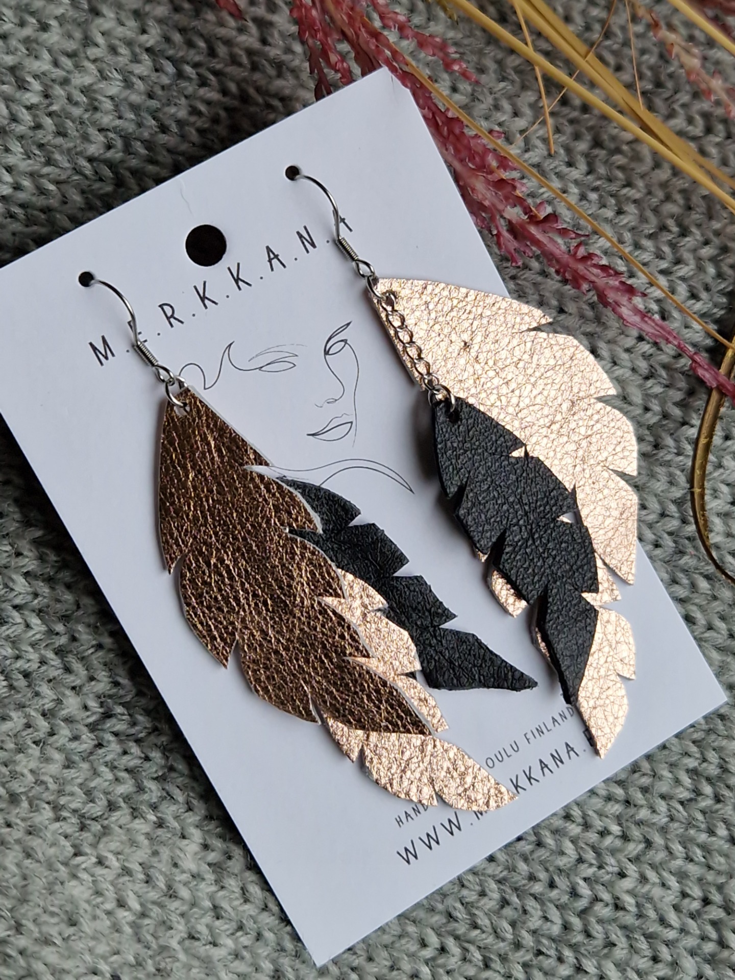 Ruusukullan ja mustan väreissä olevat käsinleikatut korvakorut.
