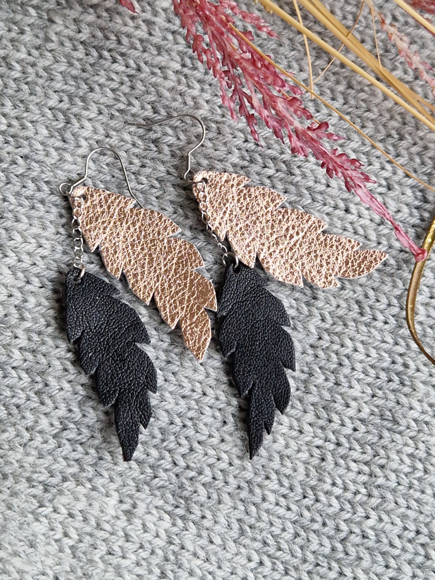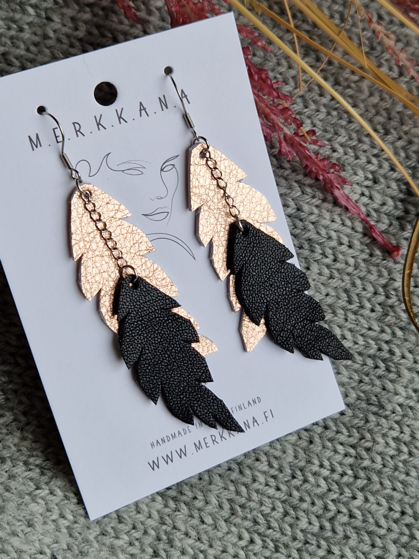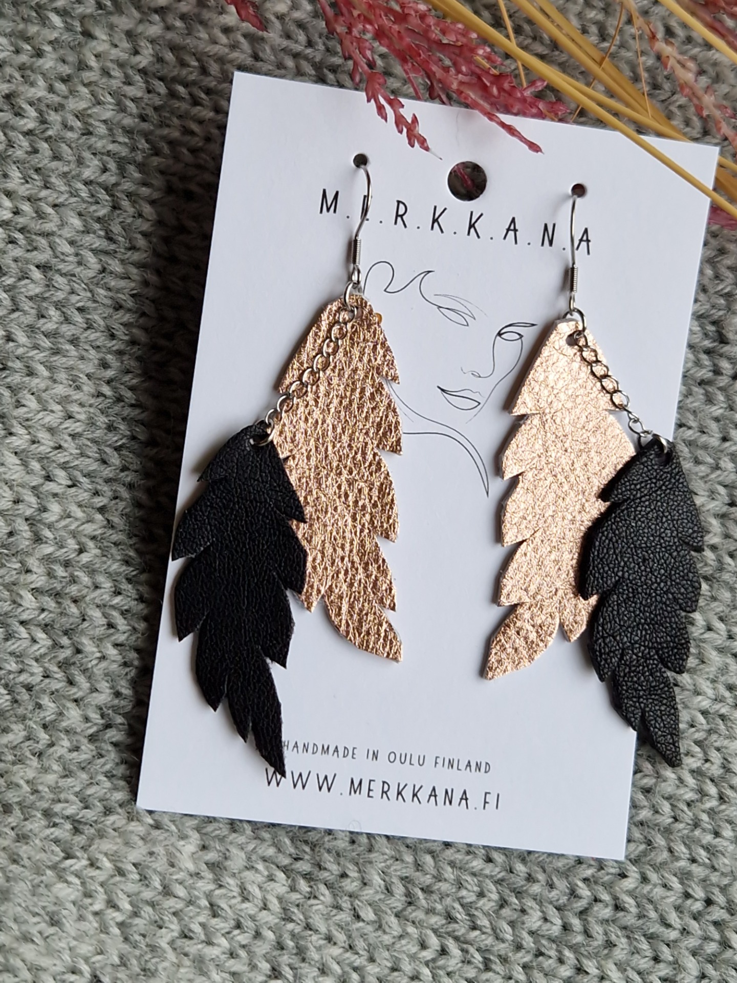 Ruusukullan ja mustan väreissä olevat käsinleikatut korvakorut.